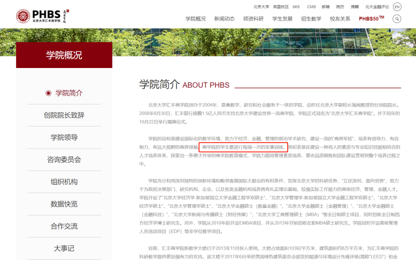北大汇丰商学院作为“商界军校”,军训是该校一大特色,从学校官网的简介可以看出北京大学汇丰商学院每周都要进行一次军事训练,锻炼大家的意志力,培养团队建设能力。