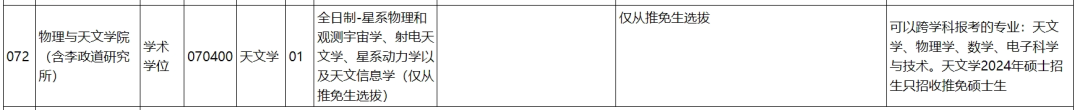 上海交通大学在2024年的招生目录里明确提到物理与天文学院天文学,只从推免生中选拔,可以跨考的专业包括物理学、天文学、数学、电子科学与。