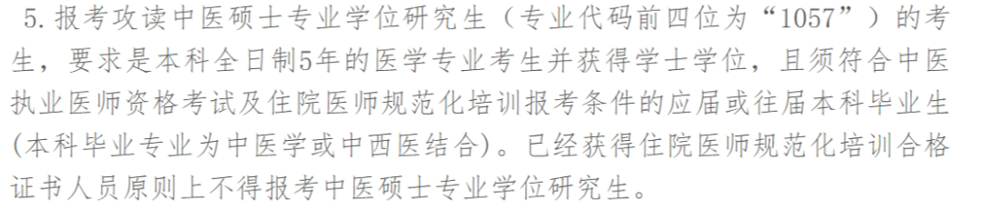 报考中医硕士专业学位招生对象为:获得学士学位本科全日制5年的医学专业考生,且须符合中医医师资格报考条件规定的专业要求的应届或往届本科毕业生(本科毕业专业为中医学或中西医结合)。