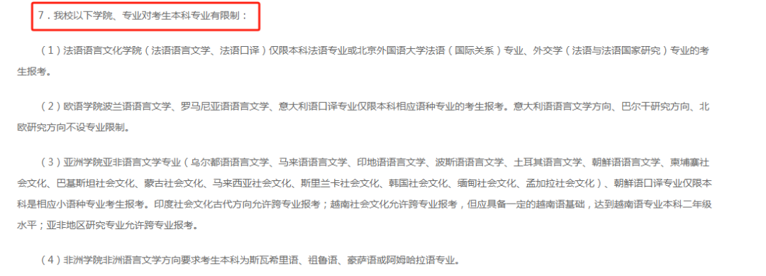 北京外国语大学在2024年招生简章里面明确提到法语语言文化学院,欧洲语言文化学院、非洲学院等对报考其开设的语种专业考生有限制。