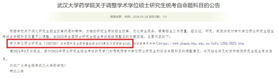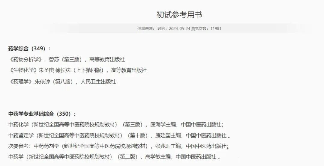 学术学位硕士研究生(100700)自命题科目由药学基础综合678更改为药学综合349。同时学校给出了参考书目,初试参考用书详见