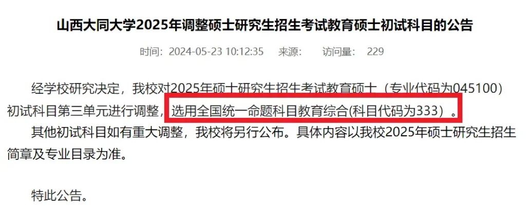 2025年调整硕士研究生招生考试教育硕士初试科目的公告
