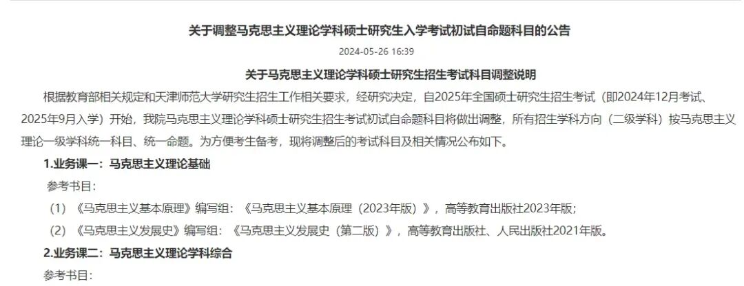 自2025年全国硕士研究生招生考试(即2024年12月考试、2025年9月入学)开始,我院马克思主义理论学科硕士研究生招生考试初试自命题科目将做出调整,所有招生学科方向(二级学科)按马克思主义理论一级学科统一科目、统一命题。为方便考生备考,现将调整后的考试科目及相关情况公布如下。