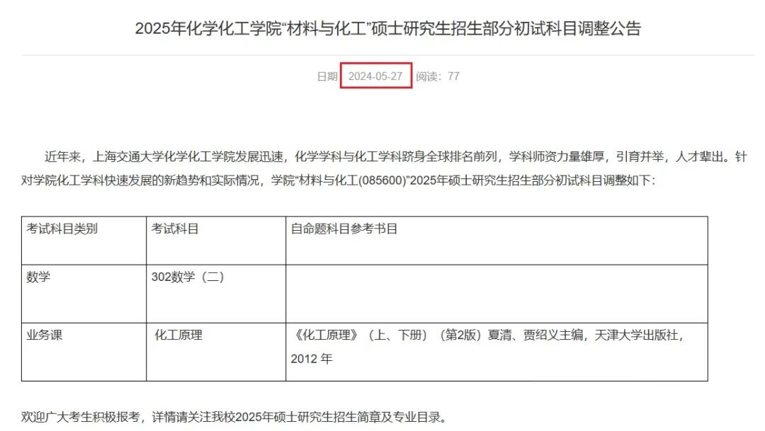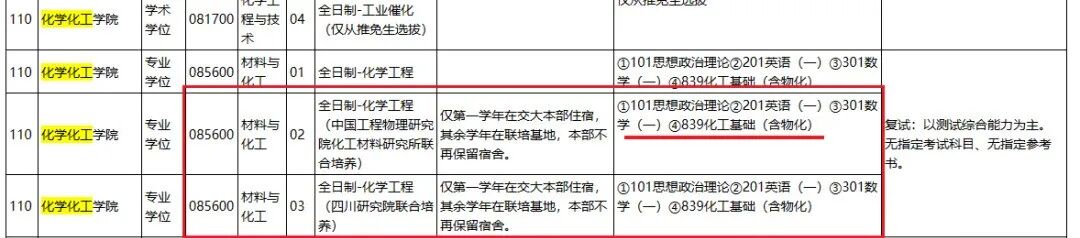 2025年化学化工学院“材料与化工”硕士研究生招生部分初试科目调整公告
