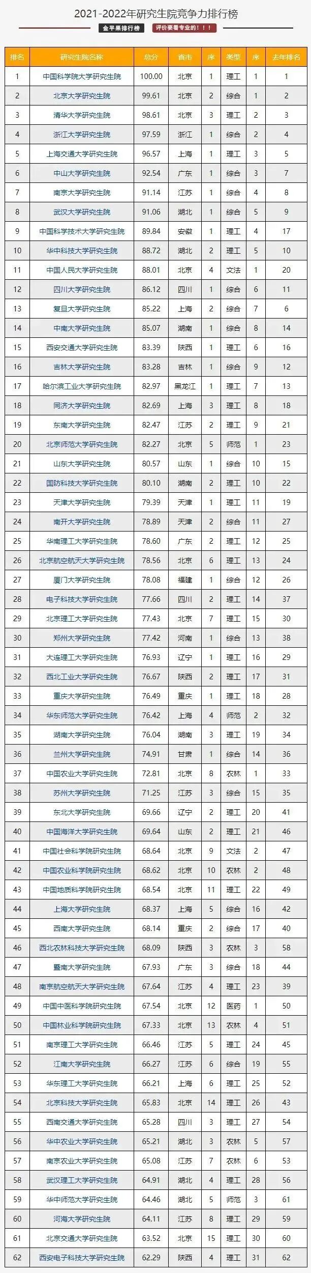 并且此次的榜单上的排名仅62所,只针对内地的研究生院,不包括部分军事类院校和港澳台地区高校。