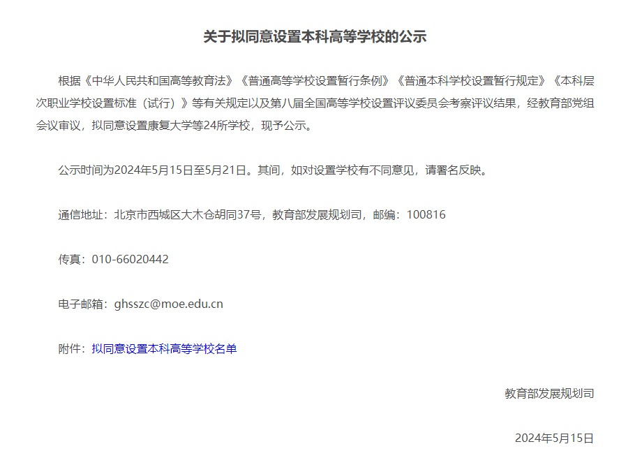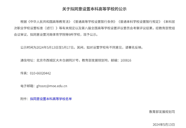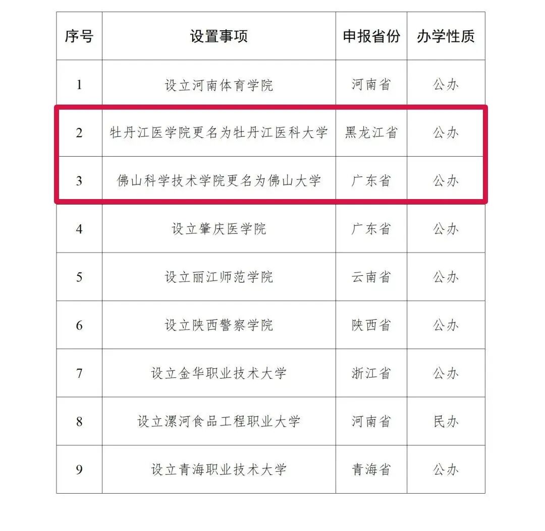 在此之前的5月13日,教育部发布《关于拟同意设置本科高等学校的公示》,其中2所学院更名为大学:牡丹江医学院更名为牡丹江医科大学,佛山科学技术学院更名为佛山大学。
