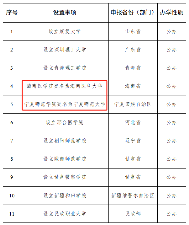 5月15日,教育部发布《关于拟同意设置本科高等学校的公示》,其中2所学院更名为大学:海南医学院更名为海南医科大学,宁夏师范学院更名为宁夏师范大学。