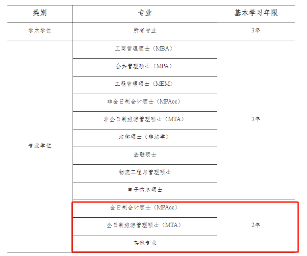 2年全日制专硕:全日制会计硕士(MPAcc)、全日制旅游管理硕士(MTA)与其他专业。