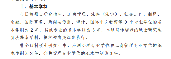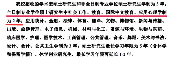 2年全日制专硕:金融、应用统计、税务、国际商务、资产评估、法律(法学)、国际中文教育、英语笔译、日语笔译、出版、体育教学、运动训练、审计、工商管理、会计、工业工程与管理、物流工程与管理等专业仍读2年。