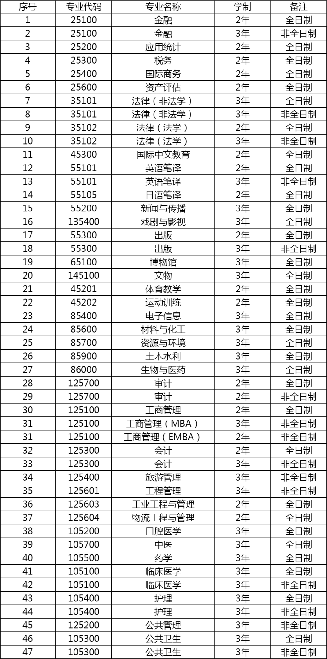 2年全日制专硕:工商管理、法律(法学)、社会工作、翻译、金融、国际商务、新闻与传播、审计、国际中文教育等