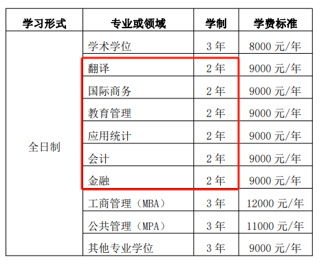 2年全日制专硕:翻译、国际商务、教育管理、应用统计、会计、金融。