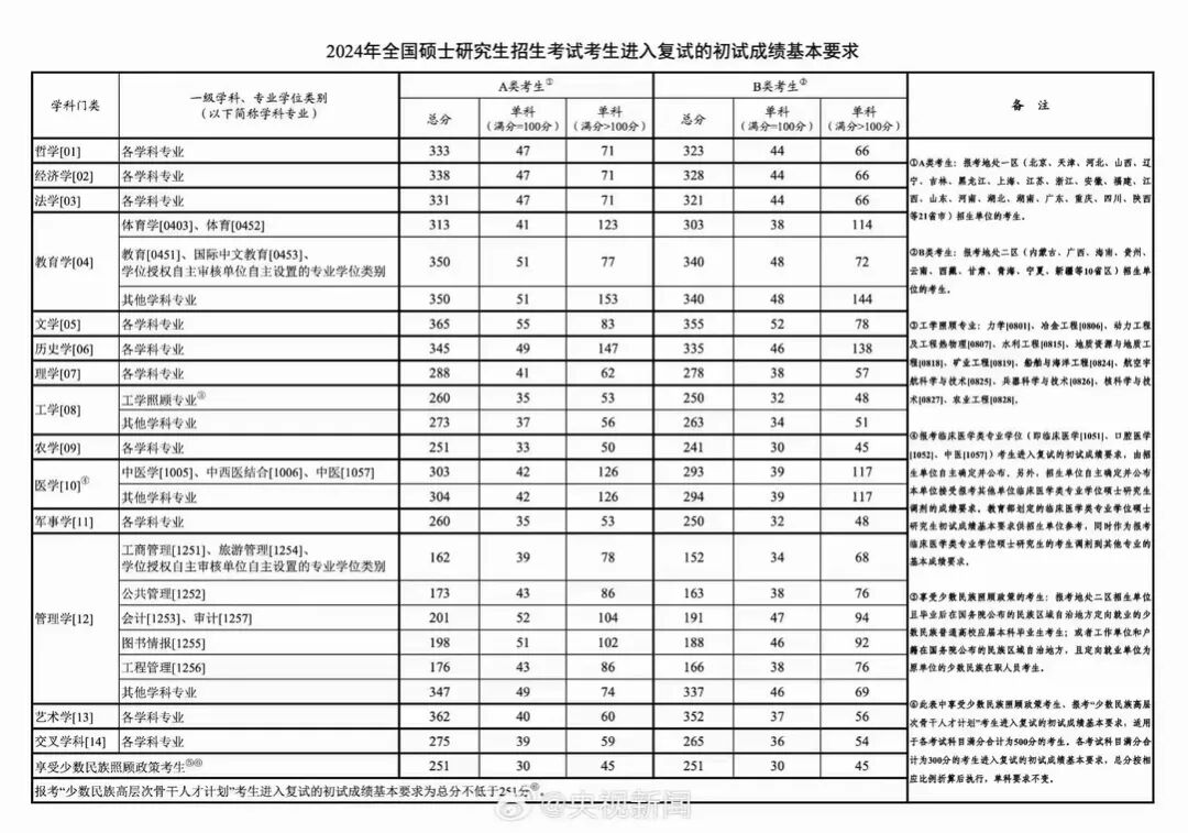 教育部同时发布《2024年全国硕士研究生招生考试考生进入复试的初试成绩基本要求》(国家分数线)。各招生单位根据《2024年全国硕士研究生招生工作管理规定》,在国家分数线的基础上,自主确定并公布报考本单位的考生进入复试的初试成绩要求及其他学术要求。