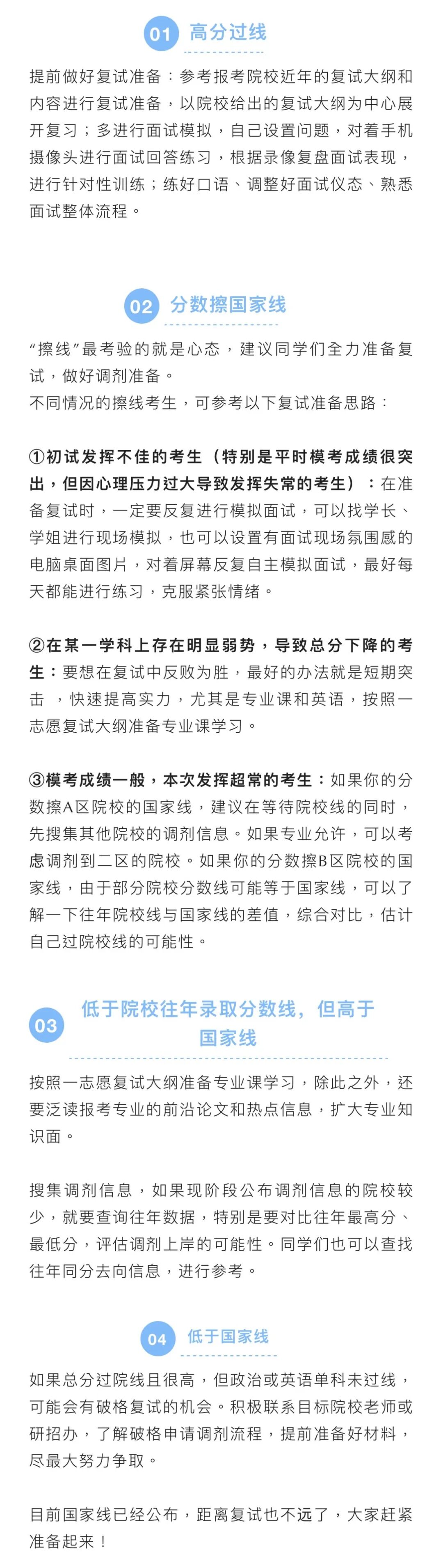 国家线公布之后,大家需要做些什么?根据分数不同,需要准备的事情也不同,主要有以下几类:
