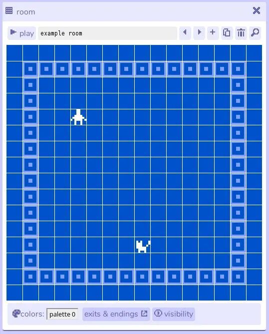 Bitsy 的基本元素是一个代表玩家的头像、发生游戏动作的房间、精灵(可以与之互动的非玩家角色)和物品。有一个用于创建这些元素的位图编辑器,它也支持简单的两帧动画。