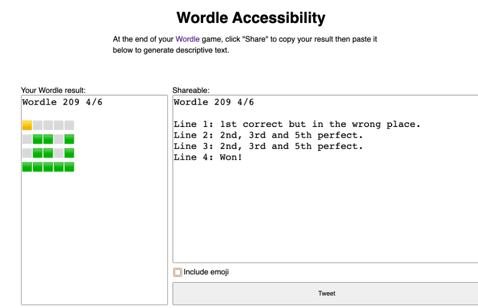 人们通过将产生的字母网格粘贴到社交媒体上来分享他们在游戏中的进展,这很容易做到,因为这个网格只是 一组表情符号🔗 opensource.com。然而,表情图标和表情符存在无障碍问题。虽然它们很容易复制和粘贴,但对于生活在低视力或色盲的人来说,共享的结果可能很难看清。灰色、黄色、绿色的颜色对一些人来说可能很难区分。