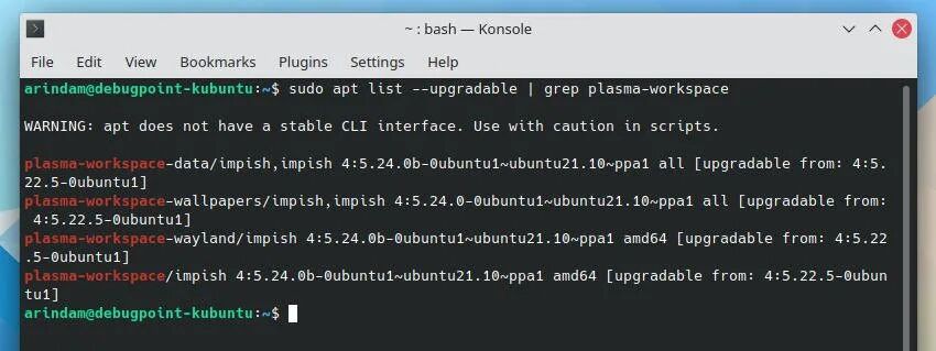 打开 Konsole,运行以下命令来添加 backports PPA。如果你喜欢,你可以验证你运行的 Plasma 是什么版本。
