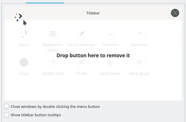 GNOME 著名的是它的窗口标题栏上只有一个按钮,所以导航到“标题栏按钮(Titlebar Buttons)”标签,然后通过将“关闭(Close)”按钮从标题栏图像拖到处置区域来删除所有按钮。