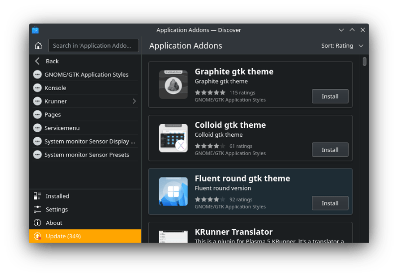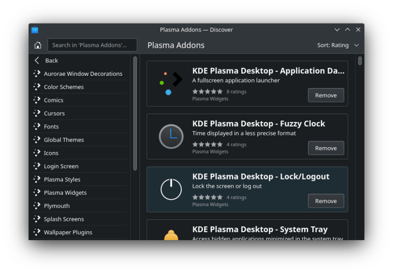 不像 GNOME 从浏览器中添加扩展的那种不方便的方式(使用另一个浏览器扩展),你可以使用“发现”软件中心直接访问 KDE 的附加组件。