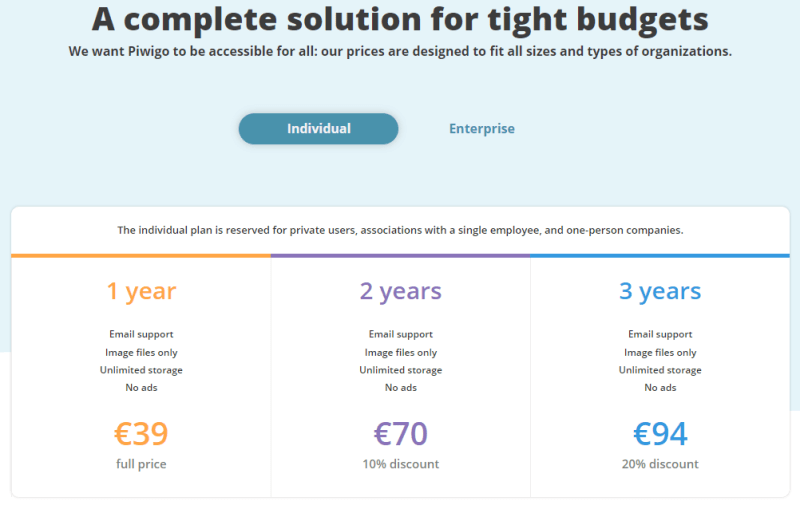 如果你选择 云托管选项🔗 piwigo.com(作为个人),定价从每年 39 欧元 开始,不限图片文件上传,如果你订阅 3 年,价格会更便宜。