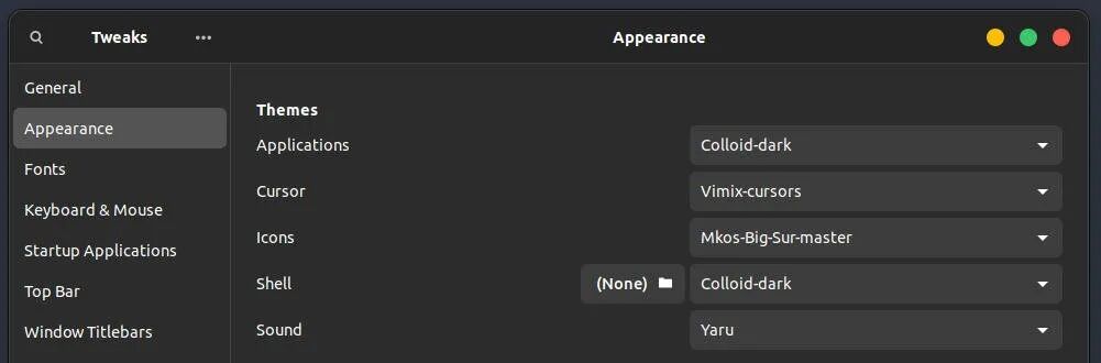将应用主题改为 “Colloid Dark”,光标主题为 “Vimix Cursors”,图标主题为 “Mkos-big-sur”,Shell 主题为 “Colloid Dark”。如果你愿意,你可以选择浅色主题和不同的选项。