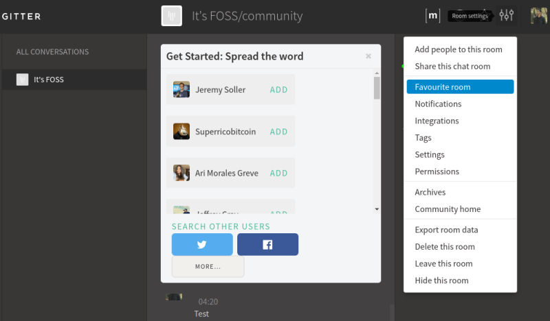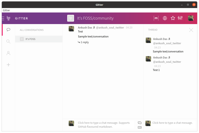 Gitter🔗 gitter.im(现在是 Element🔗 itsfoss.com 的一部分,也是一个协作/聊天应用)的目标就是这样。它是一个由开源技术驱动的社区平台(Matrix🔗 matrix.org 协议)。