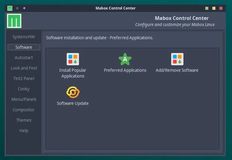 Mabox 还包括控制中心,以有效管理你的系统。Mabox 控制中心可以让你添加/删除应用、更新你的系统、启动窗口管理组件的几个配置窗口,诸如此类。