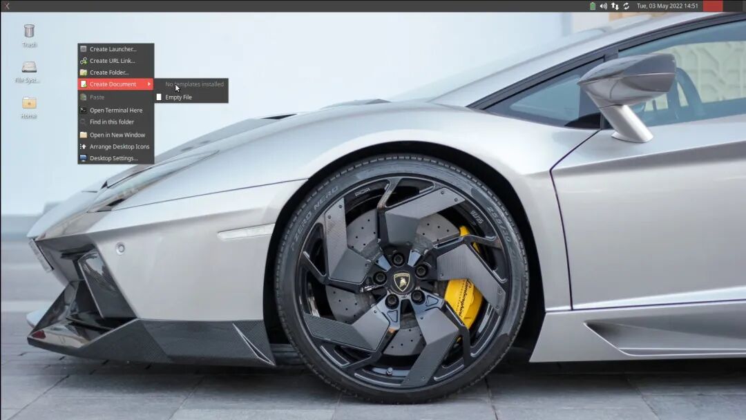 其次,顶部面板右侧有 “鼠须菜单(Whisker Menu)” 和标准的系统托盘,带有音量控制、电池指示、网络/Wi-Fi 和日期/时间。