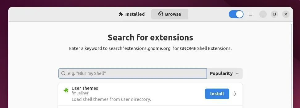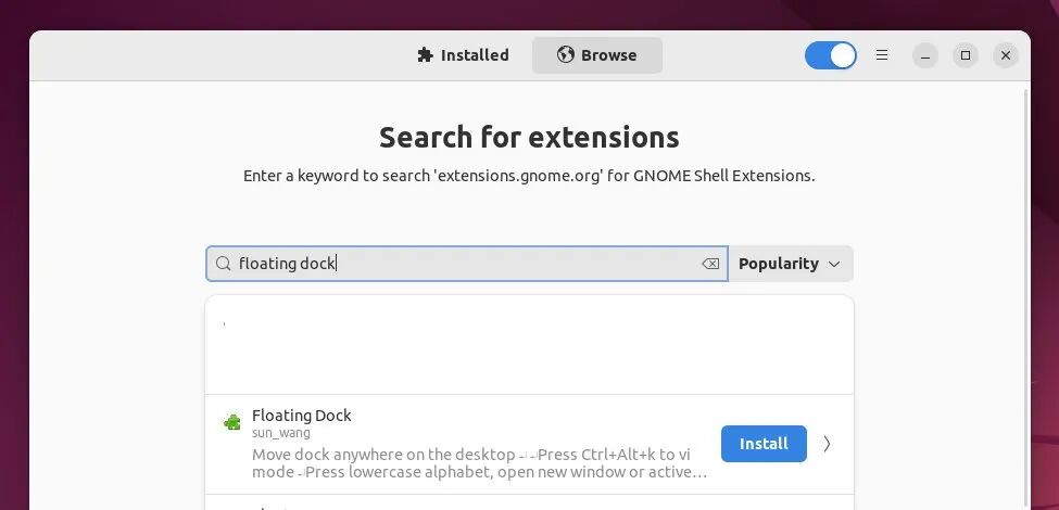 打开扩展管理器应用,并安装两个扩展。第一个是 “浮动停靠区(Floating Dock)”,它提供了超酷的停靠区,你可以在桌面上的任何位置移动它。第二个,安装 “用户主题(User themes)” 扩展来帮助你在 Ubuntu Linux 中安装外部 GTK 主题。