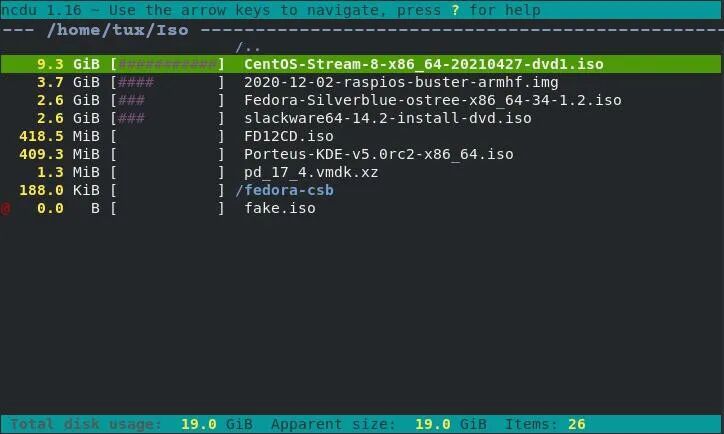 在 Linux 上,你可以从你的软件仓库安装 ncdu。例如,在 Fedora 或 CentOS 上: