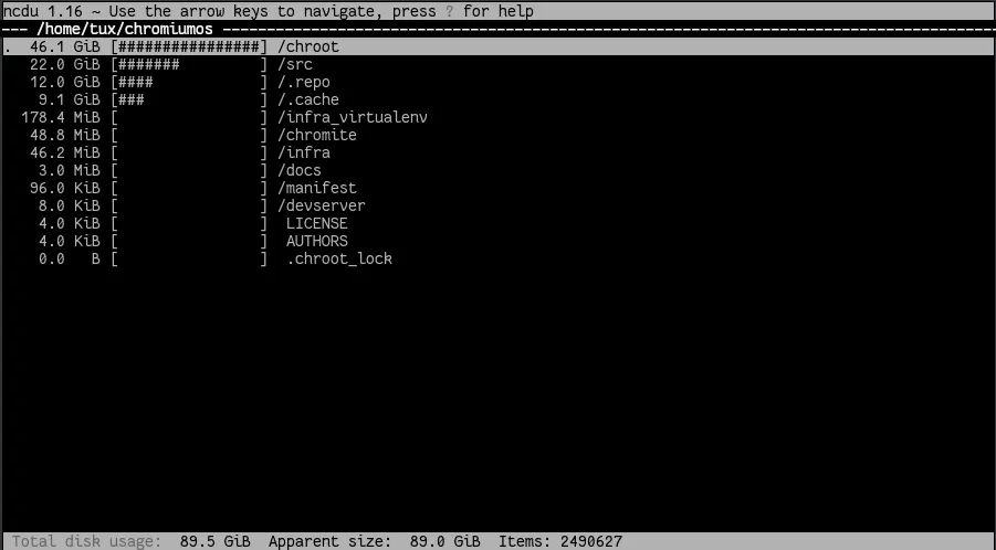 ncdu 1.16 ~ Use the arrow keys to navigate, press ? for help