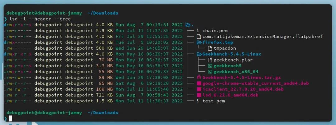 我想向你展示的第一个应用叫做 lsd,也就是 “LSDeluxe” 的缩写。它是对 GNU ls 命令的重写,具有列标题、各种项目的颜色、字体和图标支持等附加功能。