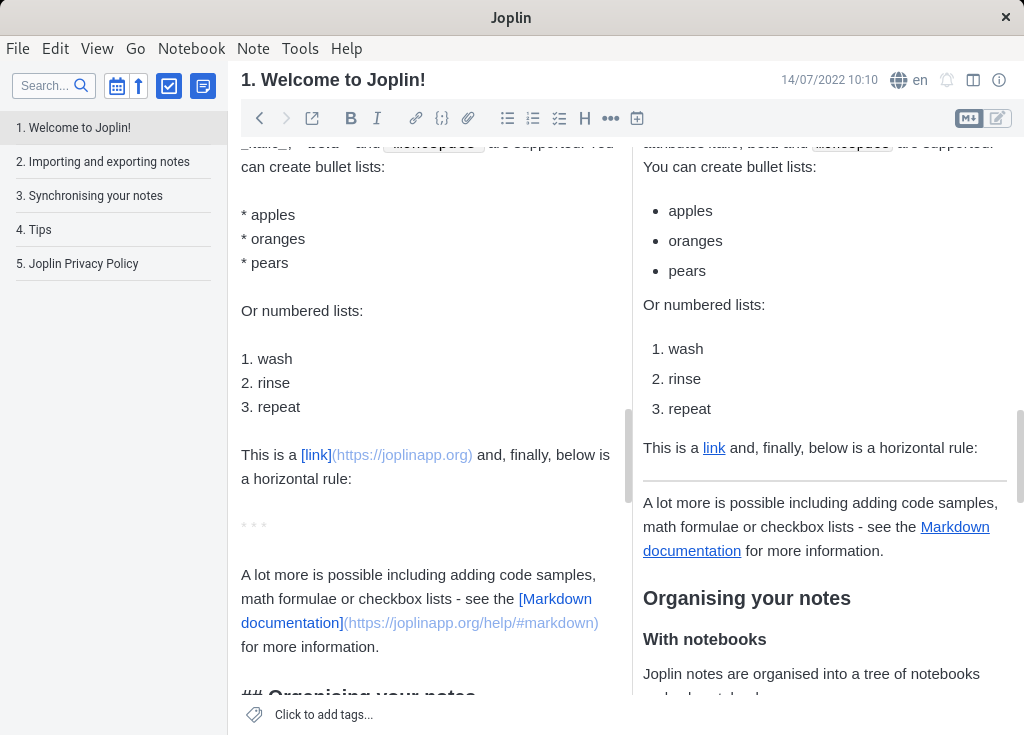 Joplin🔗 joplinapp.org 适用于 Linux、Windows、macOS、Android 和 iOS。我喜欢 Joplin,因为它会自动保存你添加的任何内容。笔记可以上传到 NextCloud、OwnCloud、Joplin Cloud,甚至是 OneDrive、Dropbox 或任何 WebDav 应用等闭源服务。Joplin 还支持加密。