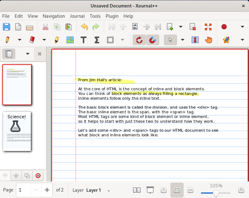 Xournal🔗 xournalpp.github.io 适用于 Linux、Windows、macOS 和 Android。它的目的是让你创建包含几乎任何你可以想象的媒体类型的笔记。它支持压敏手写笔和绘图板,因此你可以创建 涂鸦笔记🔗 opensource.com。你可以在里面打字、绘制简单的矢量、导入图形、录制音频等等。你还可以使用 Xournal 来注释 PDF,这就是我使用它的方式。它以 GPLv2 许可证发布,你可以以多种格式导出笔记。
