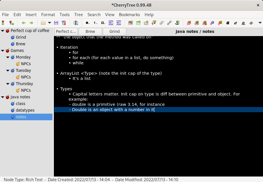CherryTree 支持层级笔记。在 CherryTree 中,所有东西都是一个节点。节点可以是纯文本、富文本、各种编程语言的语法高亮。每个节点可以有子节点,每个子节点有不同的格式。
