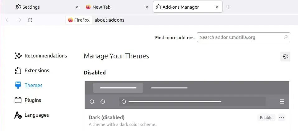 选择“深色主题(Dark Theme)”并点击“启用(enable)”。然后你应该看到深色模式被应用到 Firefox。