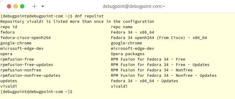首先,使用以下命令查看添加到 Fedora 系统的仓库列表。