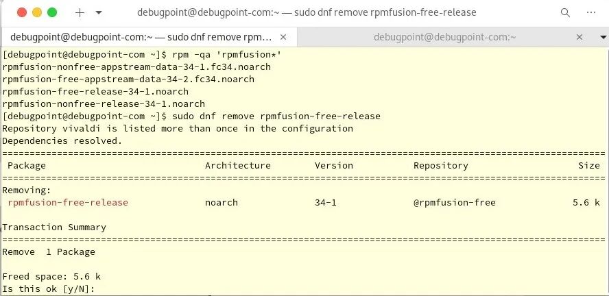 如你所见,添加了 rpmfusion 自由和非自由仓库。要通过 dnf 删除它,你需要使用以下命令准确知道仓库文件名。