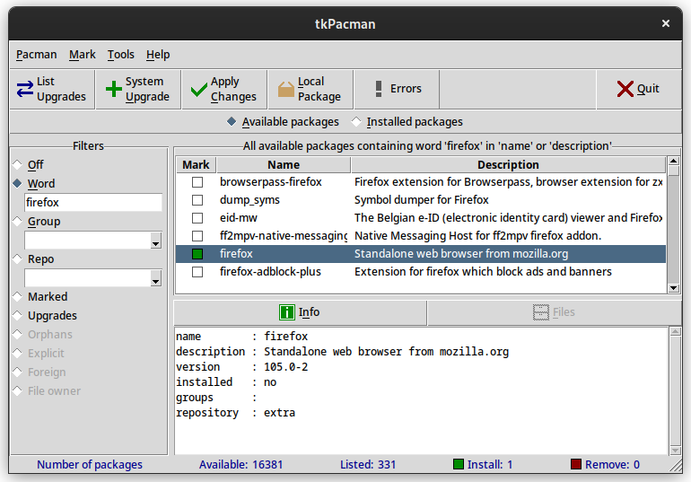 它是用 Tcl 编写的 Tk pacman 封装。界面类似于 Synaptic 包管理器🔗 itsfoss.com。