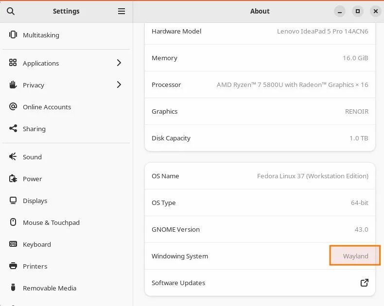如果你需要图形方法,请打开你的 Linux 发行版的设置应用。在关于部分,你应该看到某个标签下中的 Wayland/X11。