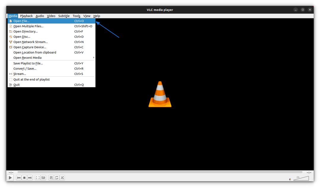 为了裁剪视频,你需要在 VLC 中打开它。你可以通过“媒体(Media) > 打开文件(Open File)”在 VLC 播放器中打开视频: