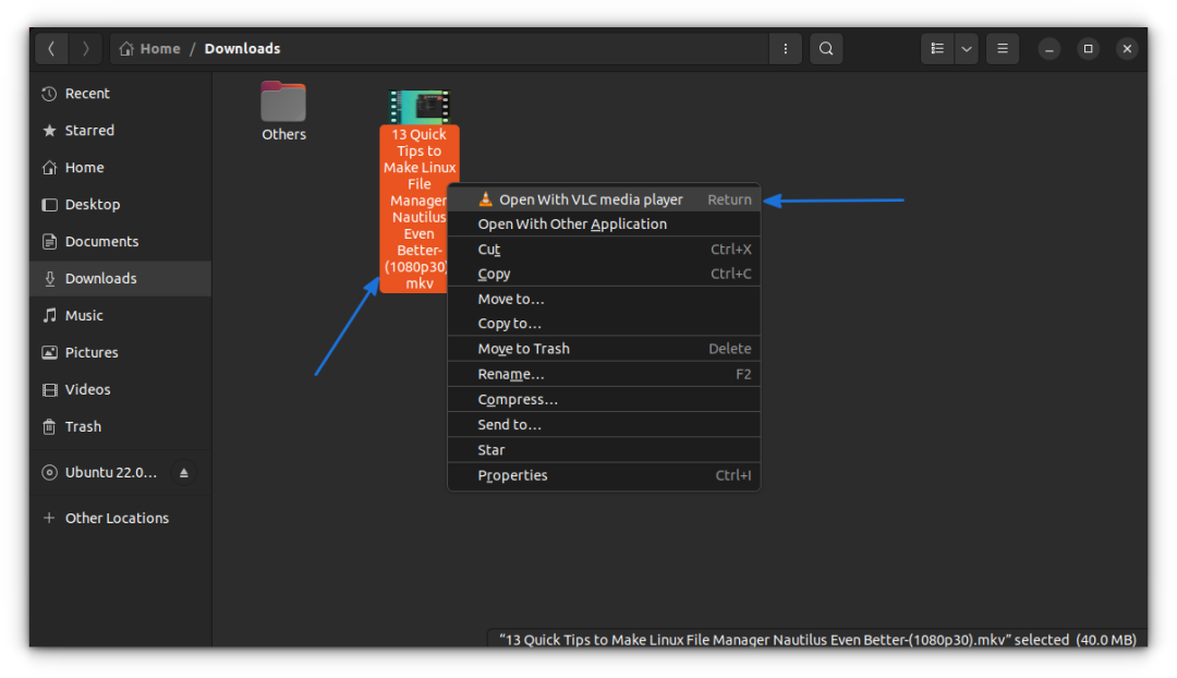 或者你可以使用 Nautilus 文件管理器中的 VLC 打开视频文件: