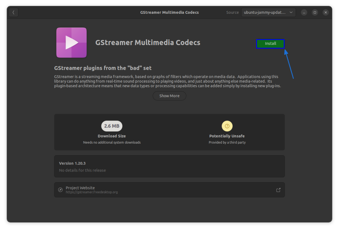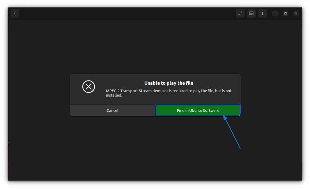 你可以点击上图所示的 “在 Ubuntu 软件应用中查找(Find in Ubuntu Software)” 按钮,这将打开 Ubuntu 软件中心。你可以在那里安装所需的编解码器包。