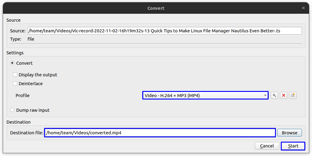 如果你不想为此安装任何额外的软件包,你可以使用 VLC 本身将 .ts 文件转换为 mp4 格式以在任何其他播放器中播放。