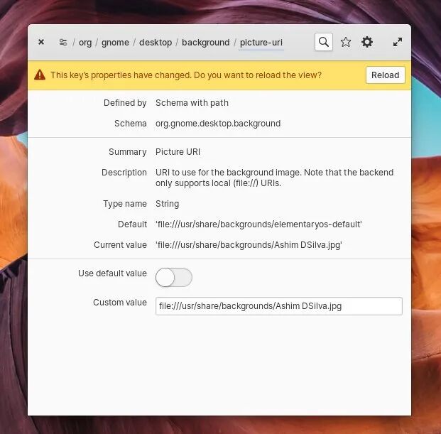 接着从菜单启动 dconf 编辑器。进入 org > gnome > desktop > background > picture-uri。关闭默认值并添加自定义值 file:////usr/share/backgrounds/Ashim DSilva.jpg。你也可以使用任何其他图像。保存并关闭。