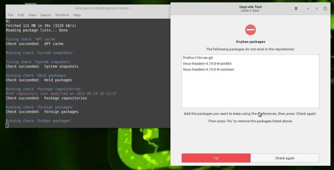 此外,该图形界面是一个封装器,为 mintupgrade 程序带来了更多功能,它带来了一组系统前检查和带有一键修复的升级过程。