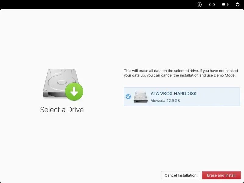在下面的屏幕上,选择要安装操作系统的驱动器,然后点击“擦除并安装(Erase and Install)”。