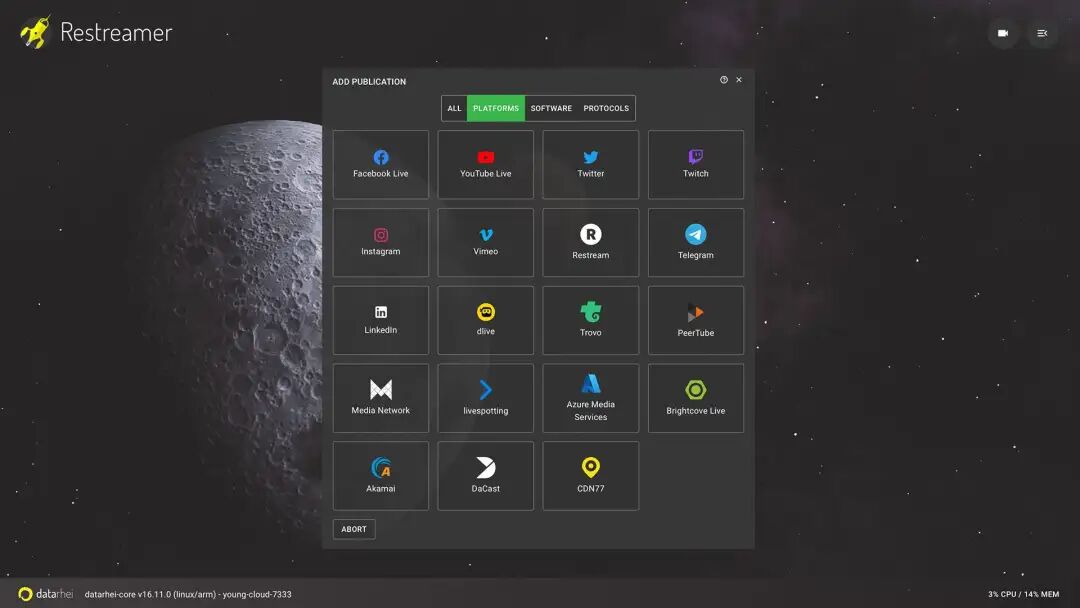 即使没有树莓派,你也可以完成这里描述的步骤。此外,还有针对 Windows🔗 docs.datarhei.com、Linux🔗 docs.datarhei.com 和 macOS🔗 docs.datarhei.com 的进一步安装说明。