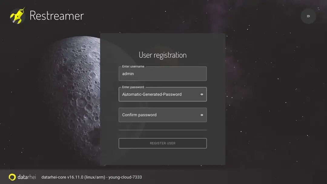 提示:上述 Docker 命令将带有登录名和密码的配置数据永久保存在 /opt/restreamer/config 文件夹中。