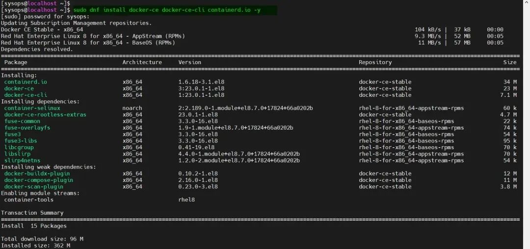 $ sudo dnf install docker-ce docker-ce-cli containerd.io -y