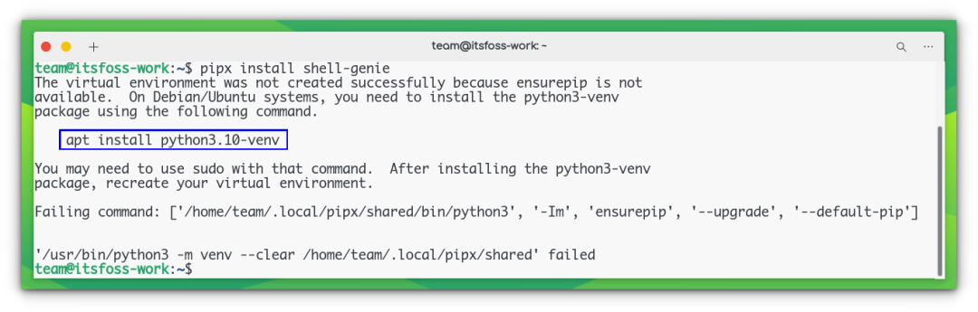 Shell-genie 在任何发行版的默认仓库中都不可用。你可以使用 pipx 安装它。